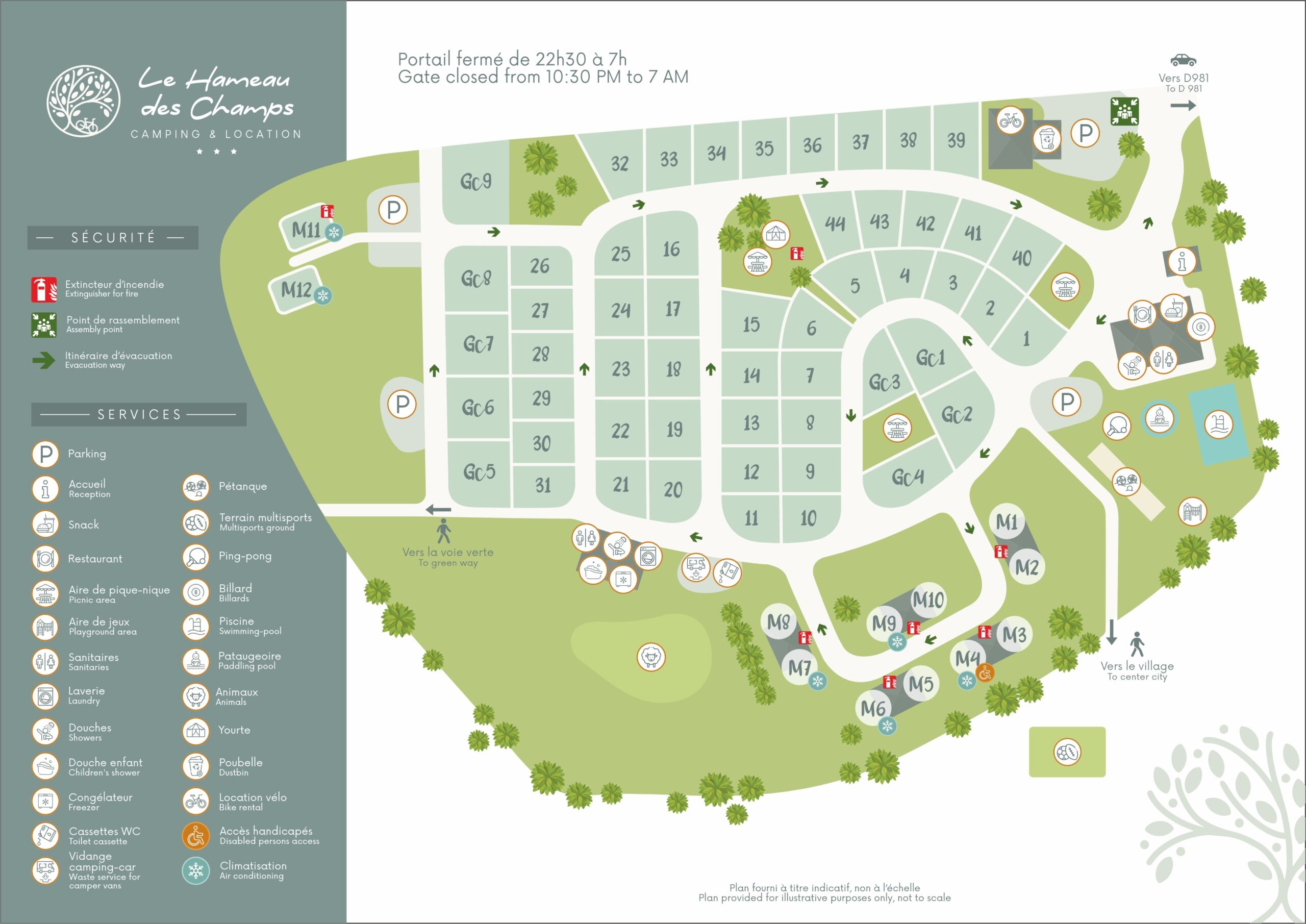 Departures must be before 11:30 a.m. for campsites and 10 a.m. for rentals. No arrivals after 8:00 p.m. to avoid disturbing the neighbors!